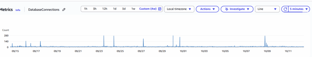 The next clue came from the DatabaseConnections metric. Yes, the peaks were obvious, but there was another interesting observation. Even at night, when traffic was minimal, the baseline number of active connections was higher than ever before.